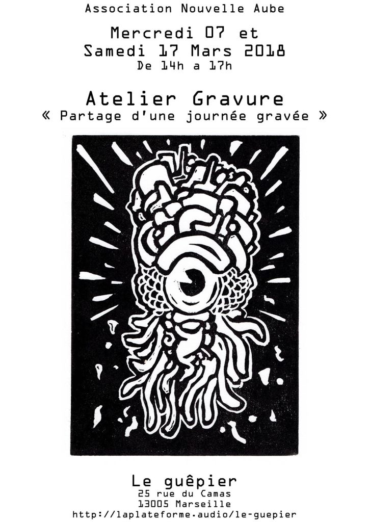 Ses deux artistes à la ville et amis dans la vie nous ont proposés ses ateliers afin de faire découvrir une technique du passé pour que chacun se l’approprie en expérimentant. Ces ateliers ont été très appréciés par les participants qui ont pu imaginer leur propre création, la dessiner, la graver et l’imprimer en plusieurs exemplaires, sans presse, à la cuillère en appuyant, utilisant différentes couleurs. Tout ça en 3 h à chaque atelier voir un plus car à force de tirages le temps aussi s’est étiré, les 30 participants (15 à chaque séance) ont réalisé les gravures disséminées dans cette revue. Pour certains c’était aussi l’occasion de découvrir le lieu qui a accueilli ses ateliers : Le Guêpier.