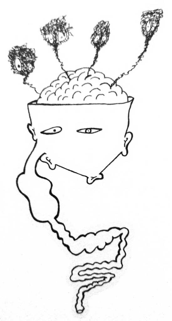 Mon univers décalé puise dans les thématiques liées au cerveau, parfois l’épilepsie, la transidentité et l’univers des monstres. J’y aborde fréquemment le thème de la folie et mes dessins se veulent dans une démarche qui mène à visibiliser le décalage mental.