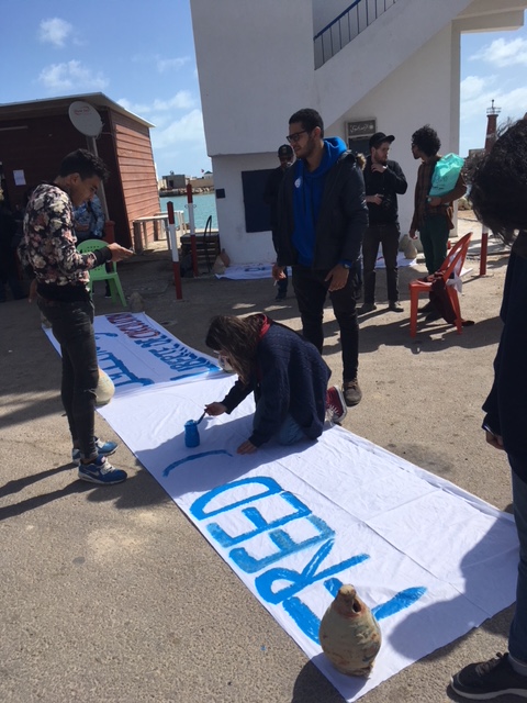 Au passage, pour pallier l’absence de douches à bord et dans la plupart des ports où on s’arrête, on va au hammam quand on en a l’occasion : c’est plutôt cool comme alternative ! Arrivée (avec les dauphins) à Zarzis samedi 7 à midi, juste à temps pour le début des rencontres auxquelles nous étions invité.e.s. On y retrouve une bonne trentaine de personnes dont certaines têtes ne sont pas inconnues. Les rencontres ont été organisées par Alarmphone Tunis et rassemblent différents collectifs pour discuter de la situation migratoire en Tunisie et plus spécifiquement dans cette ville qui se trouve à 80 km de la frontière libyenne. Parmi les participants il y a des militants d’Alarmphone venus du Maroc et de Suisse ; 4 avocats militants algériens ; une compagnie de théâtre forum de Tunis qui travaille sur la haraga (exil des jeunes tunisiens) ; des représentants de deux orgas panafricanistes de jeunes travailleurs venus de pays subsahariens et vivant en Tunisie ; un collectif de pécheurs de Zarzis, très investi dans le sauvetage de personnes en détresse et dans le refoulement du C-Star (bateau fasciste) l’été dernier ; et puis nous, invité.e.s à animer un atelier sur le thème de la sécurité en mer même si on est pas sûrs d’être des experts à ce sujet. Tout ce beau monde a pris beaucoup de plaisir à se rencontrer. Le week-end fut dense émotionnellement et très riche en apprentissage, débats, témoignages, remises en question et points de connexions.