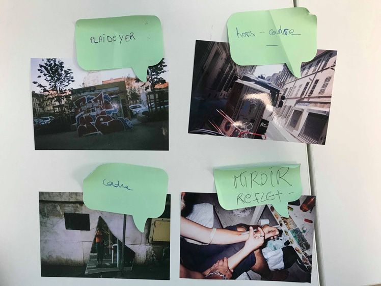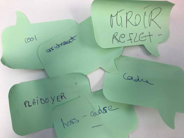 Avant de débuter la dernière séance d’atelier, nous avons distribué des post-it aux participant.e.s pour noter un mot qui qualifie la manière dont ils.elles ont vécu le photovoix.